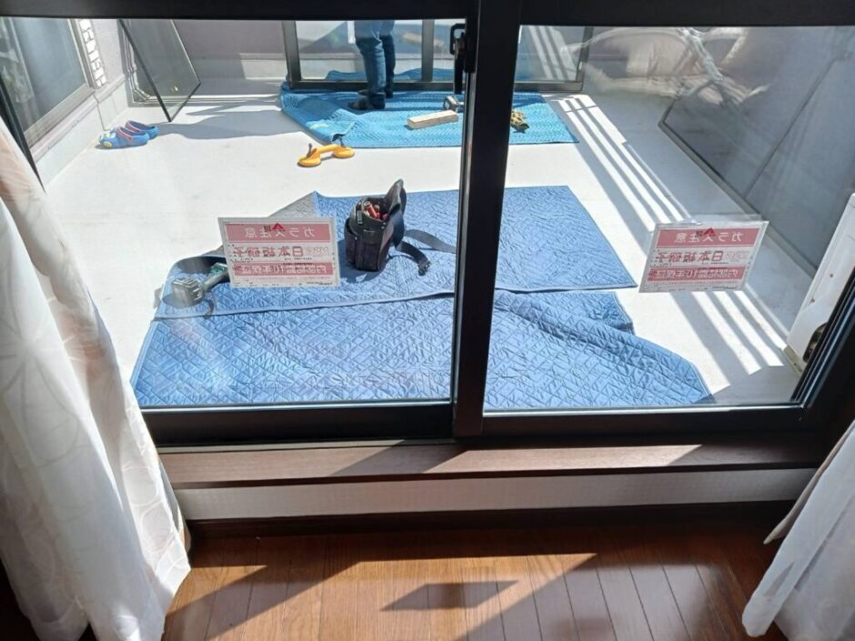 2階の掃き出し窓は特に重量があるため、作業スペースの確保が重要です。ベランダが使える場合は、室内を通さずに作業できるため、クロスや家具への接触リスクを抑えられます。
